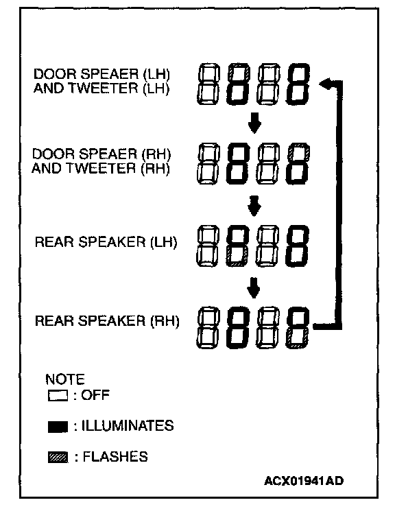 4. If a button other than the memory select "6" button and "EJECT" button is pressed, or the ignition switch is turned to "LOCK" (OFF) position, you will exit from the speaker test mode.