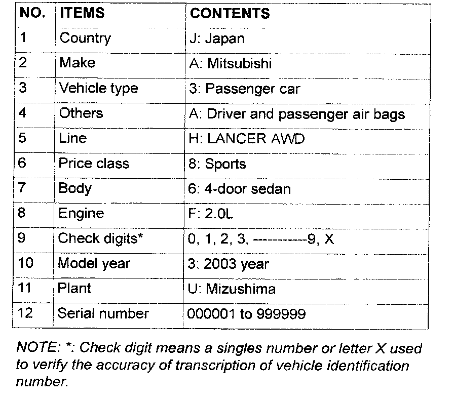 NOTE: *: Check digit means a singles number or letter X used to verify the accuracy of transcription of vehicle identification number