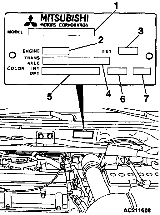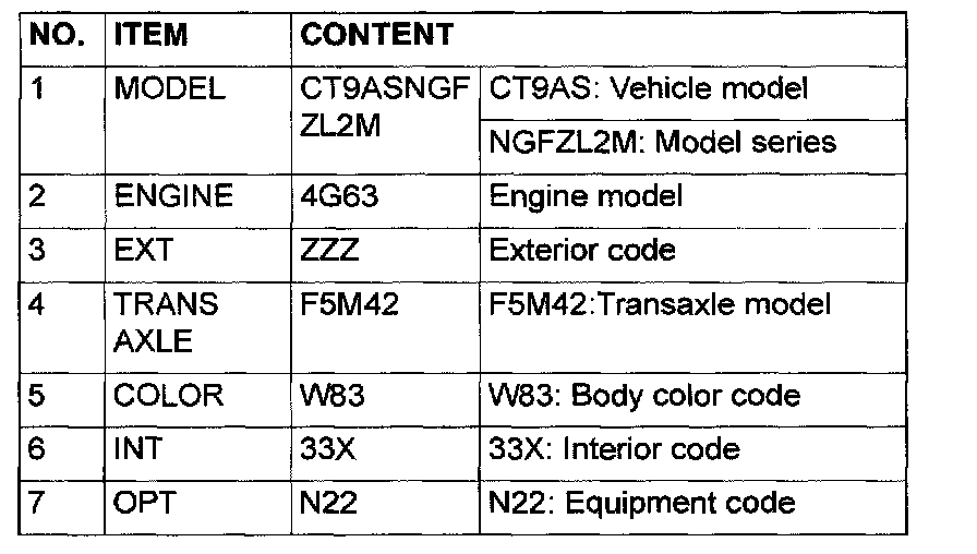 The vehicle information code plate is riveted onto the cowl top outer panel in the engine compartment. The plate shows model code, engine model, transaxle model and body color code.