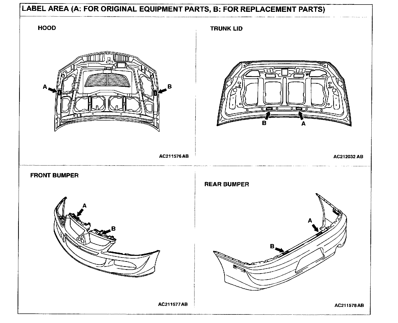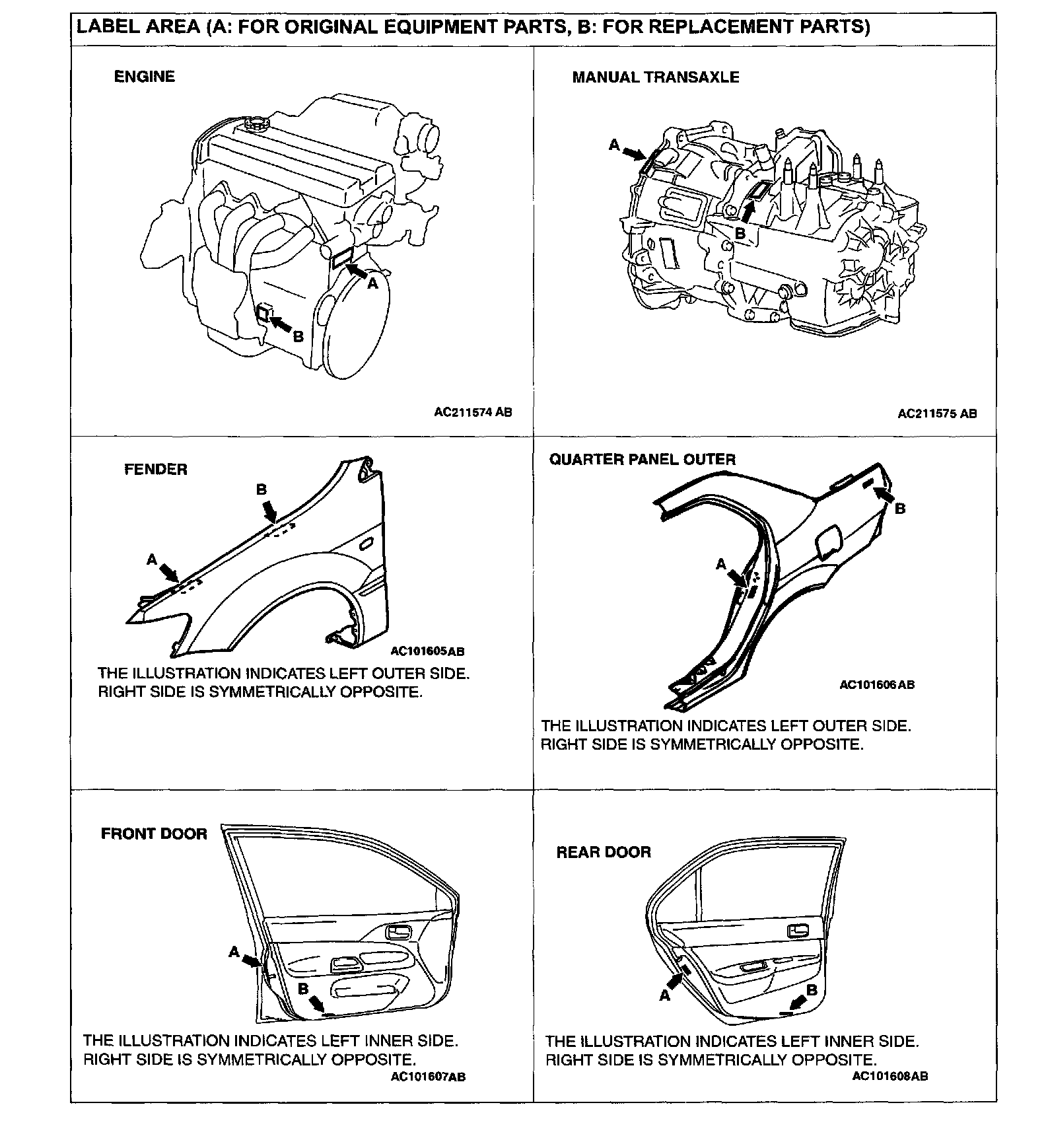 In order to protect against theft, a Vehicle Identification Number (VIN) is attached as a plate or label to the following major parts of the engine and transaxle, as well as main outer panels: Engine cylinder block, Transaxle housing, Fender, Doors, Trunk lid, Quarter panel, Hood, Bumpers In addition, a theft-protection label is attached to replacement parts for the body outer panel main components, and the same data is stamped into replacement parts for the engine and the transaxle.