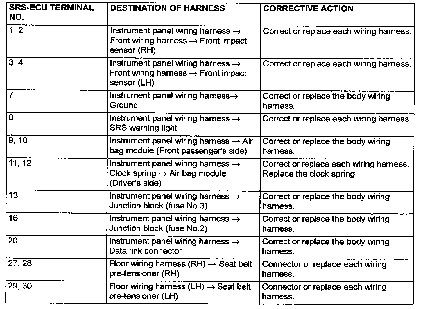 Do not attempt to repair the wiring harness connectors of the SRS. If any of the connectors are diagnosed as faulty, replace the wiring harness. If the wires are diagnosed as faulty, replace or repair the wiring harness according to the following table.