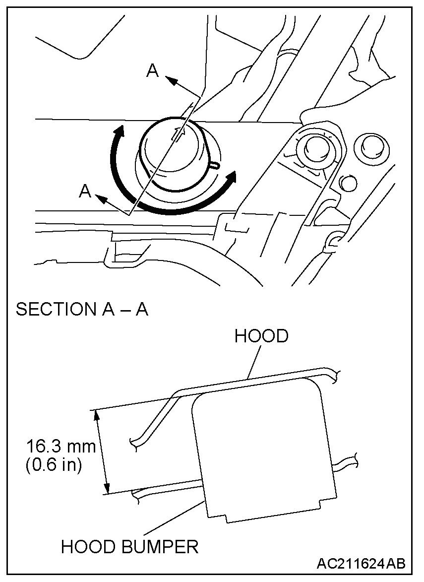 2. Rotate the hood bumper by using arrow mark on the hood bumper as a guide to adjust the hood height. If the hood bumper is rotated just one turn the hood height changes by approximately 3 mm (0.1 inch).