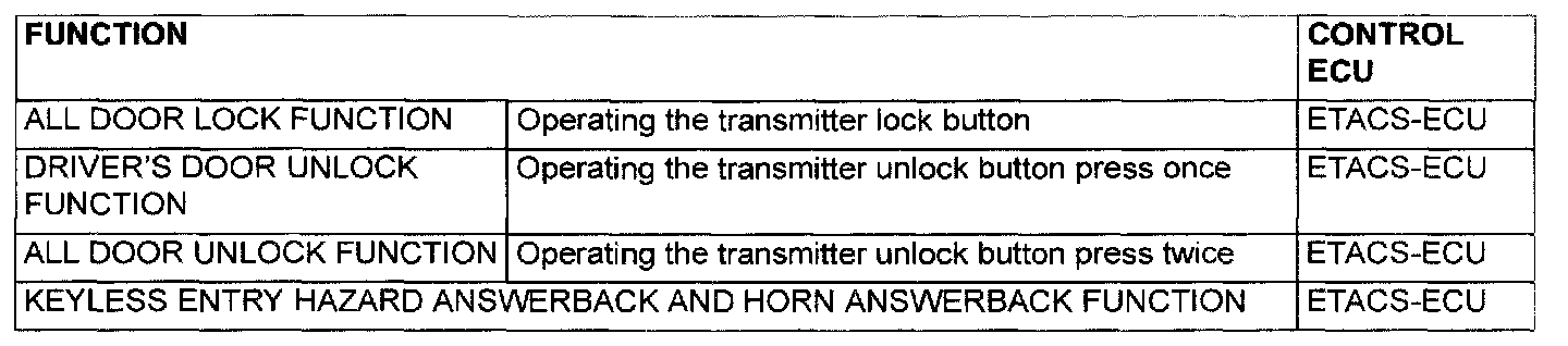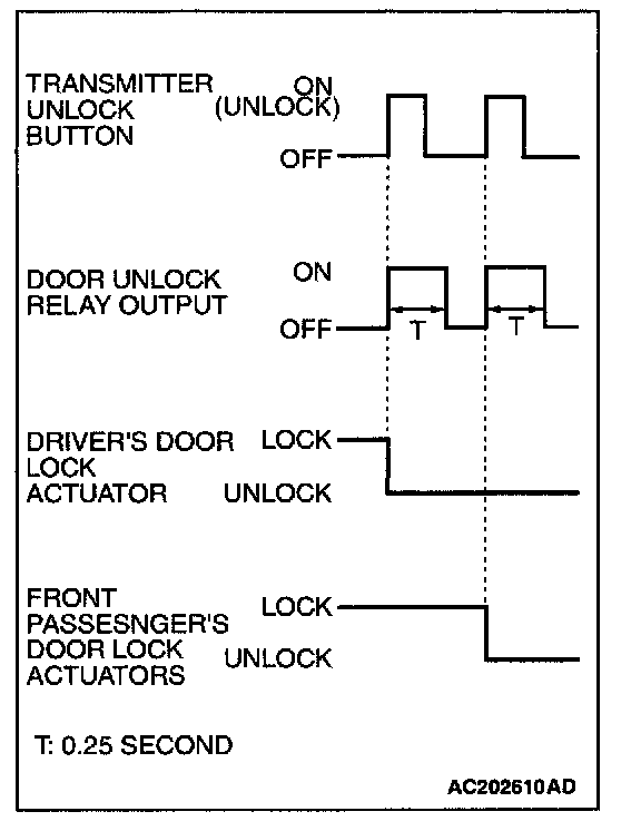 When the transmitter unlock button is pressed twice, the ETACS-ECU energizes its door unlock relay to operate the driver's door lock actuator and the other door lock actuators for 0.25 second each in succession. Then, the doors will be unlocked.