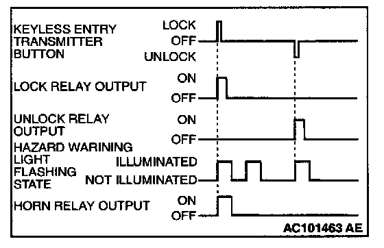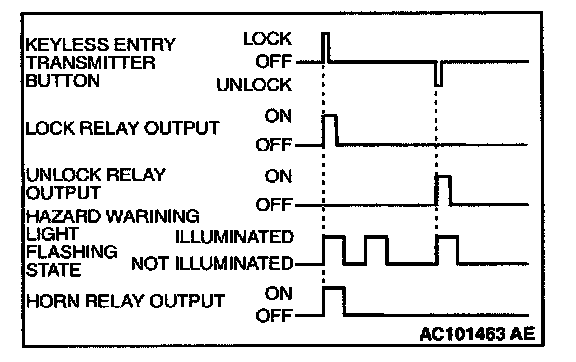 The hazard answerback and horn answerback function which facilities checking of lock or unlock operations even during day-time is provided. When the lock signal is input from the keyless entry transmitter to the ETACS-ECU, the hazard warning light flashes twice and horn sounds once. When the unlock signal is input, hazard warning light flashes once.