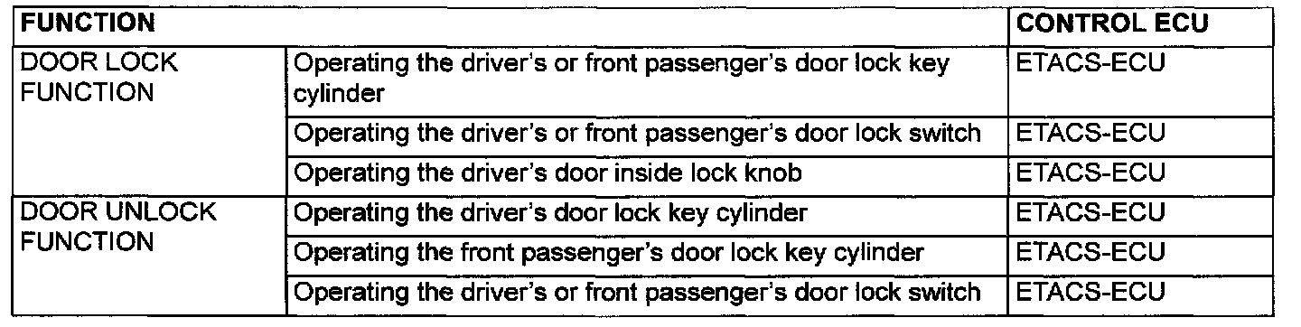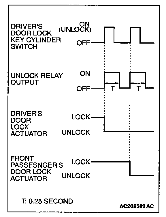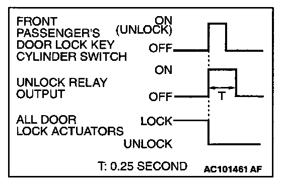 When you insert the ignition key to the front passenger's door lock key cylinder and turn the key counterclockwise to unlock the door, the ETACS-ECU energizes its door unlock relay for 0.25 second to activate all the door lock actuators. Then all the doors will be unlocked.