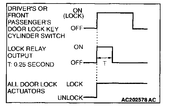 When the door is locked by driver's or front passenger's door lock switch, the ETACS-ECU energizes its door lock relay for 0.25 second to activate all the door lock actuators. Then all the doors will be locked.