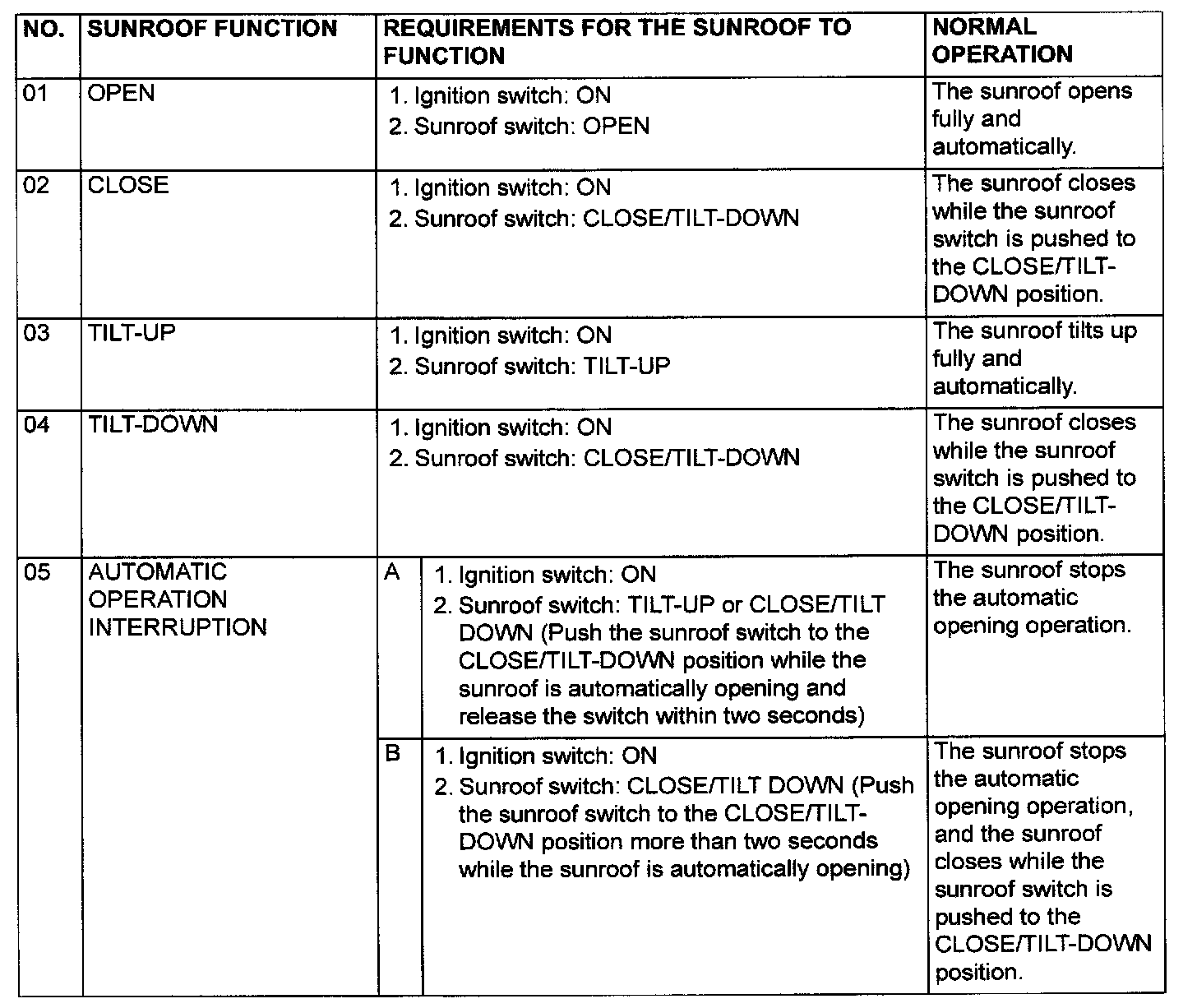 Operation CheckCheck that the following items. If faulty, replace the sunroof-ECU (sunroof motor assembly).