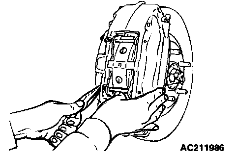 NOTE: The brake pads have indicators that contact the brake disc when the brake pad thickness becomes 2 mm (0.08 inch), and emit a squealing sound to warn the driver.