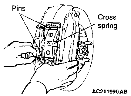 1. Holding the cross spring with one hand, pull the pin out of the caliper