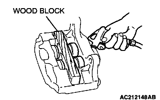 Remove the pistons by pumping in air slowly from the brake hose connection. Be sure to use a wood block and adjust the height of the four pistons so that the pistons protrude evenly.