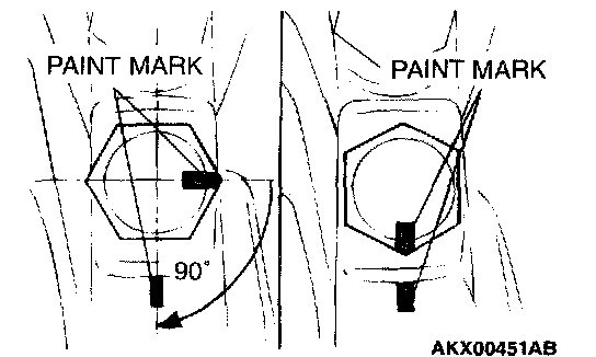6. Make a paint mark on the bearing cap at the position 90 degree angle from the paint mark made on the bolt in the direction of tightening the bolt.