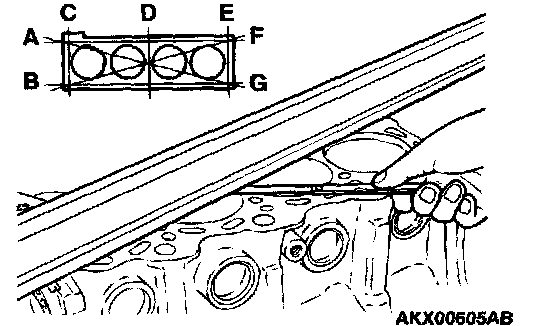 2. Using a straightedge and feeler gauge, check the block top surface for warpage. Make sure that the surface is free from gasket chips and other foreign matter.