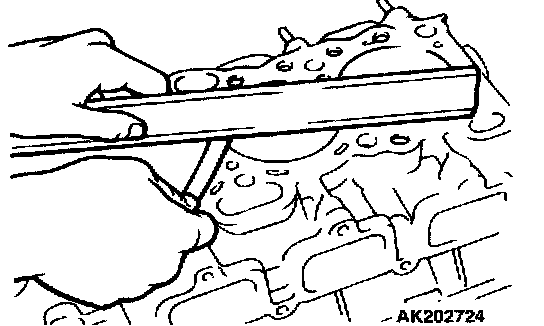 3. Check the cylinder head gasket surface for flatness by using a straight edge and feeler gauge.