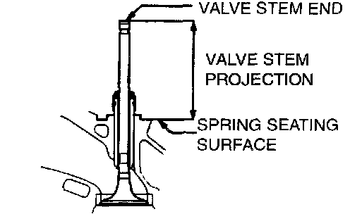 Assemble the valve, then measure the valve stem projection between the end of the valve stem and the spring seating surface. If the measurement exceeds the specified limit, replace the valve seat.
