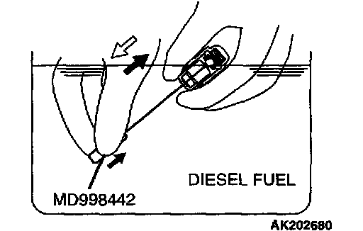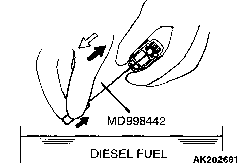 5. Soak the lash adjuster in the diesel fuel in container B. Move the plunger in and out 5 - 10 times by gently pushing the internal steel ball using the special tool MD998442 until the plunger moves smoothly to wash the lash adjuster's pressure chamber.