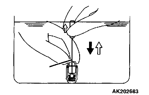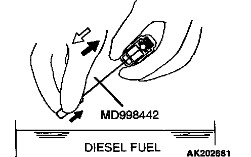 3. While gently pushing the internal steel ball using the special tool MD998442, move the plunger in and out 5 - 10 times to eliminate stiffness in the plunger and expel contaminated oil.
