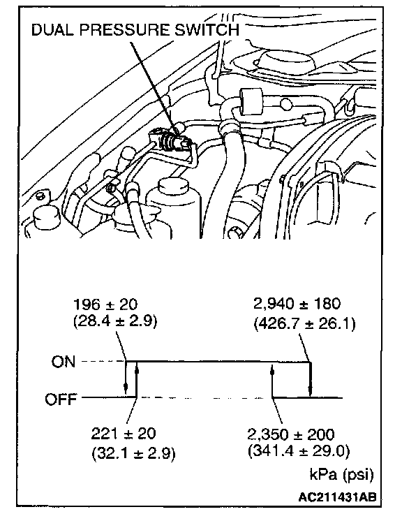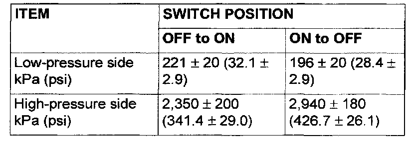 3. When the high/low pressure sides of the dual pressure switch are at operation pressure (ON) the resistance should less than two ohms between the terminals. If open circuit, replace the switch.