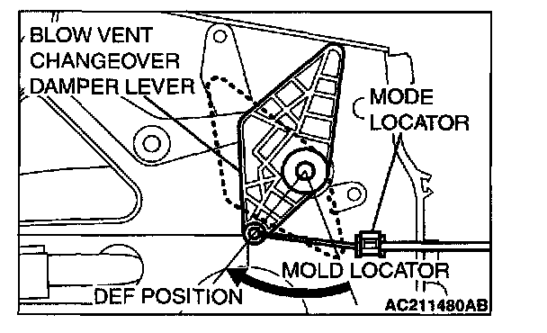 2. Set the heater unit's blow vent changeover damper lever to the DEF position (turn the damper relay to the left until it stops) and install the cable.