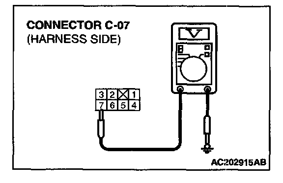 1. Disconnect outside/inside air selection damper control motor connector C-07, and measure the voltage at the harness side.
