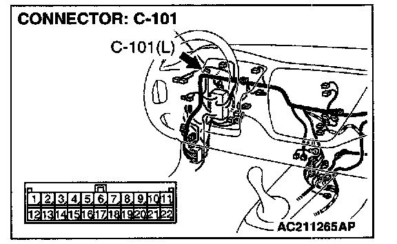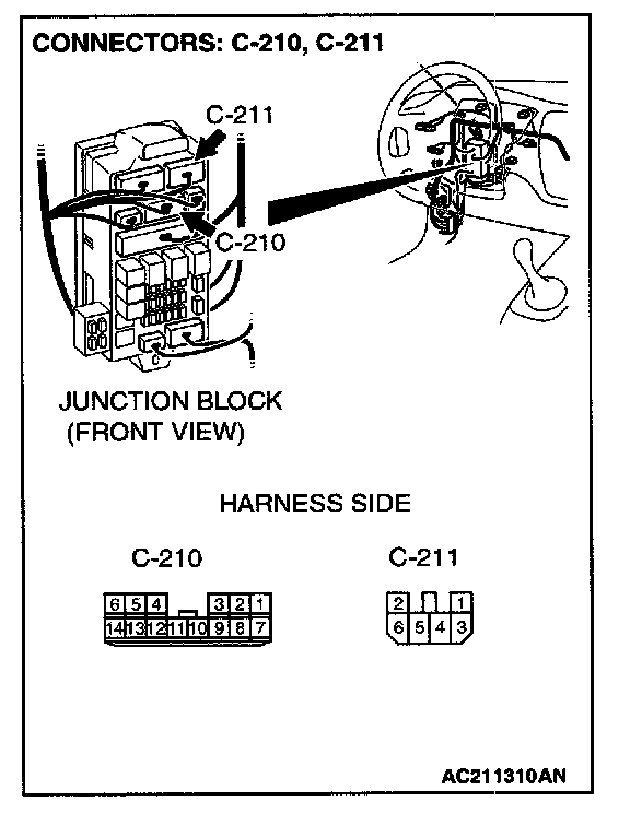 NOTE: Also check intermediate connector C-10, joint connector 2. C-101, junction block connectors C-210 and C-211 for loose, corroded, or damaged terminals, or terminals pushed back in the connector. If intermediate connector C-10, joint connector 2. C-101, junction block connectors C-210 or C-211 is damaged, repair or replace the connector as described in Harness Connector Inspection.