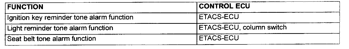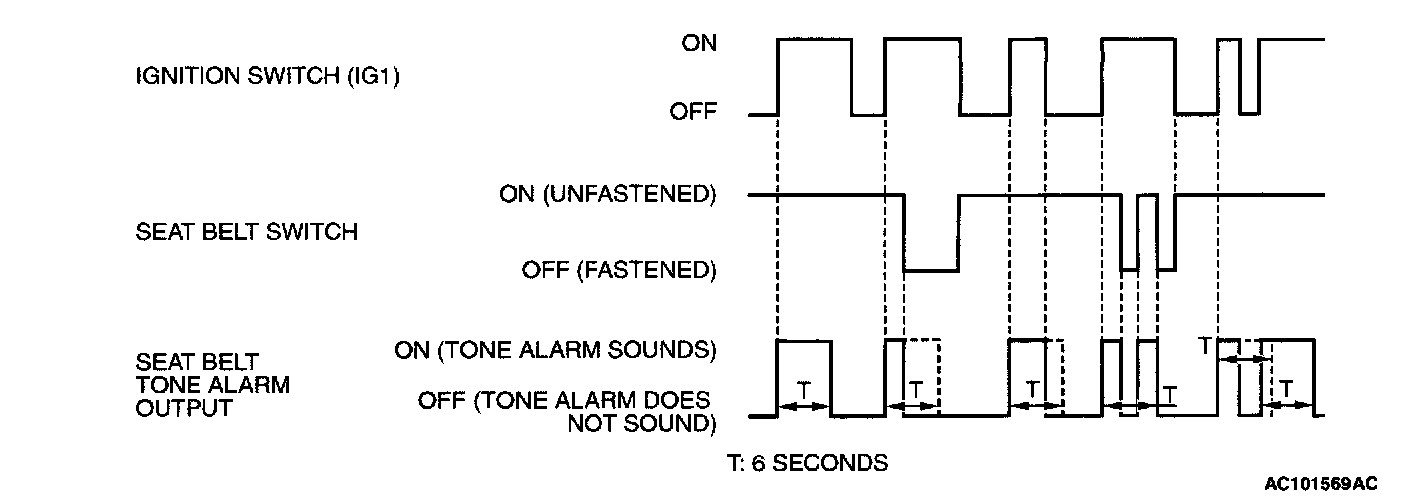 When the ignition switch is turned to ON position without fastening the driver's seat belt (driver's seat belt switch off), the tone alarm will sound for approximately six seconds to warn the driver to fasten the seat belt. When the driver's seat belt is fastened or the ignition switch is turned to OFF position, the tone alarm will stop sounding.