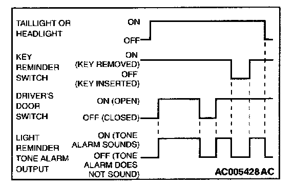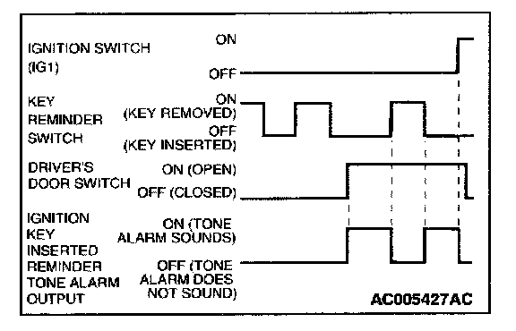 When the driver's door is opened (driver's door switch ON) without removing the ignition key [ignition switch to the "LOCK" (OFF) or "ACC" position], the tone alarm will sound intermittently to remind the driver that the ignition key has not been removed.