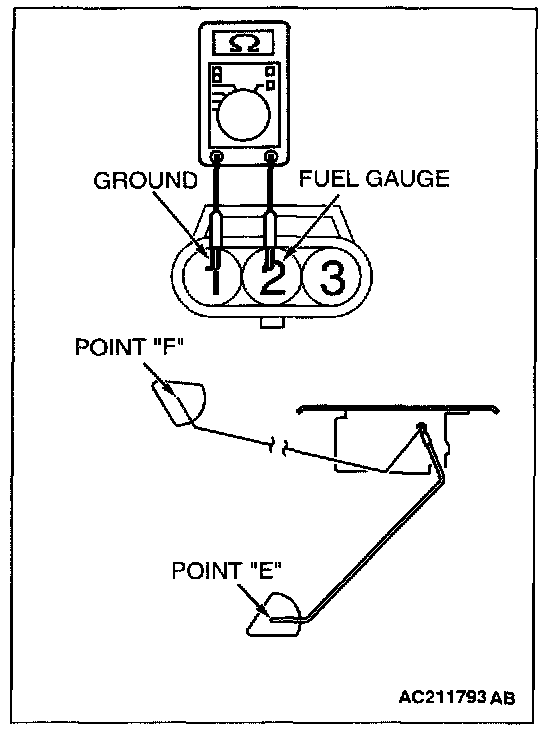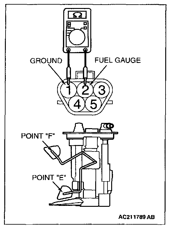 1. Check that resistance value between terminals 2 and 1 is at the standard value when the fuel gauge unit float is between point "F" (highest) and point "E" (lowest).