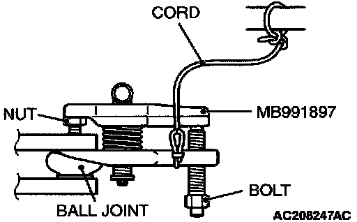 ^ Do not remove the nut from ball joint. Loosen it and use special tool MB991897 to avoid possible damage to ball joint threads.