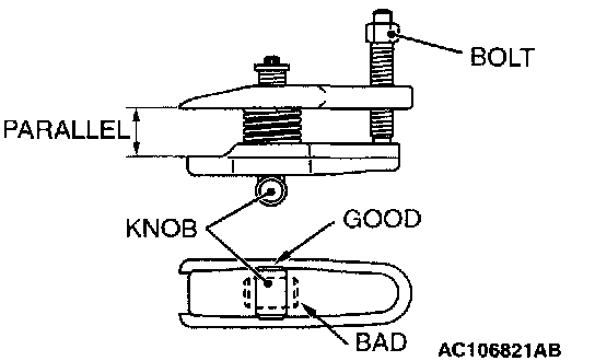 2. Turn the bolt and knob as necessary to make the jaws of special tool MB991897 parallel, tighten the bolt by hand and confirm that the jaws are still parallel.