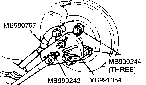 1. Use special tools MB990241 (MB990242 and MB990244), MB991354 and MB990767 to push out the drive shaft from the hub and knuckle.