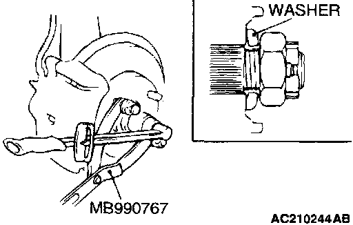 2. Using special tool MB990767, tighten the drive shaft nut to the specified torque 226 ± 19 Nm (167 ± 21 ft. lbs.).