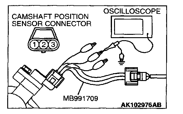 1. Disconnect the camshaft position sensor connector, and connect the test harness special tool (MB991709) in between. (All terminals should be connected.)