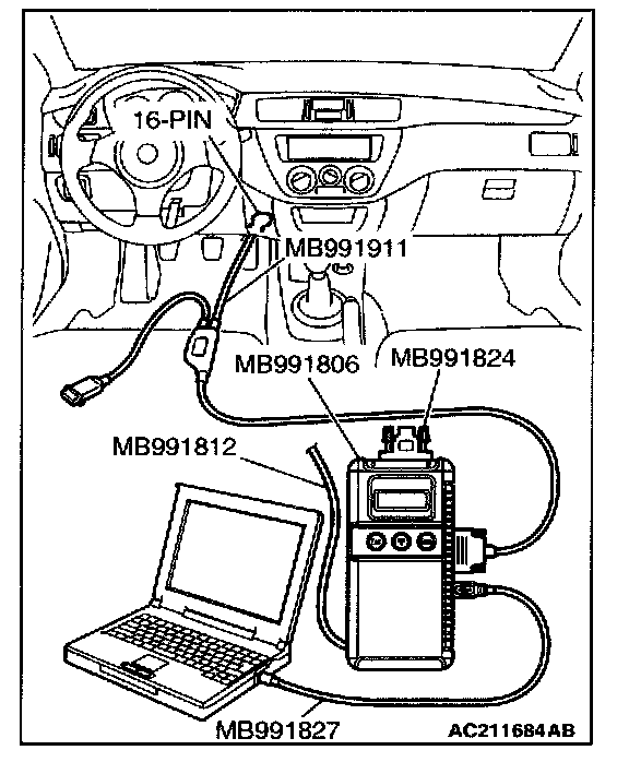 CAUTION To prevent damage to scan tool MB991502 or MB991958, always turn the ignition switch to the "LOCK" (OFF) position before connecting or disconnecting scan tool MB991502 or MB991958. Connect special tool MB991497 or MB991911 before connecting special tool MB991812. Be sure to connect special tool MB991806 after turning on special tool MB991496 or MB991824.