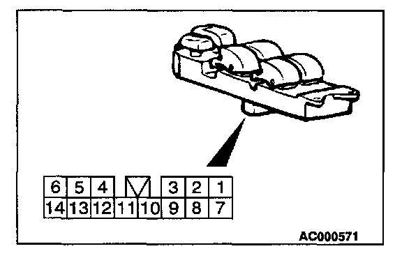 2. Check continuity while power window main switch is moved to "UP" and "DOWN" position.