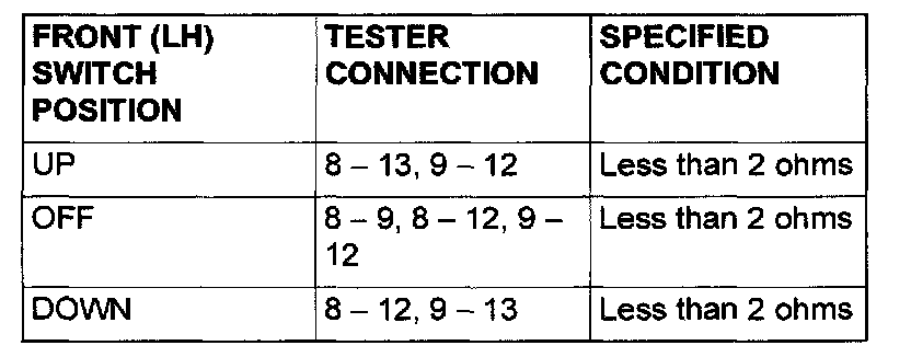 NO: Repair or replace the damaged component(s). Refer to Harness Connector Inspection. When the power window main switch is operated, the front power window (LH) should open and close normally.