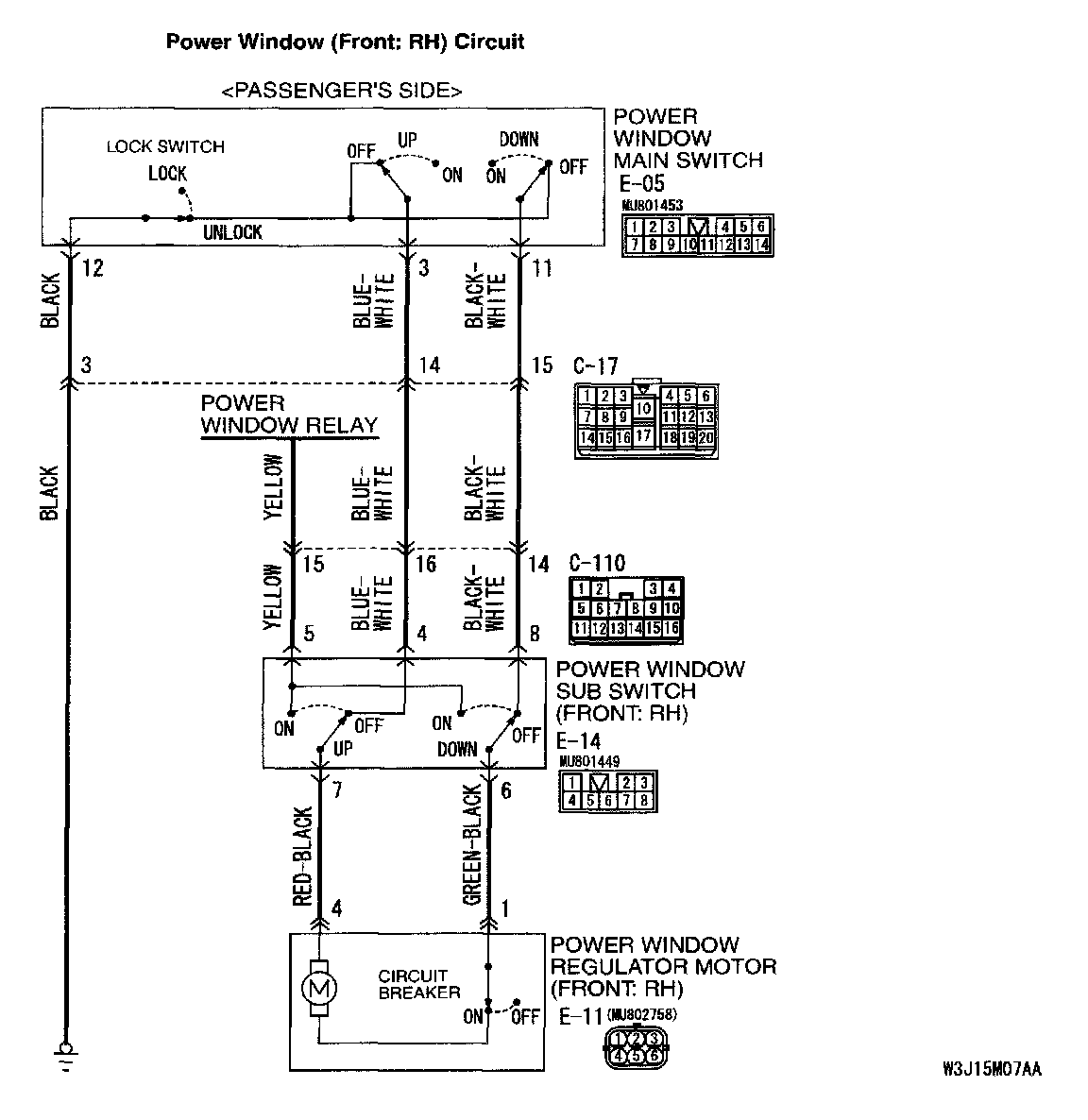 Power Windows: Front passenger's or rear power windows do not work at all by operating the power window main switch.Power Window (Front: RH) Circuit Part 1: