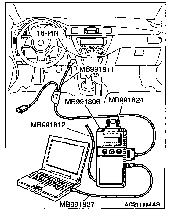 CAUTION: To prevent damage to scan tool MB991502 or MB991958, always turn the ignition switch to the "LOCK" (OFF) position before connecting or disconnecting scan tool MB991502 or MB991958. Connect special tool MB991497 or MB991911 before connecting special tool MB991812. Be sure to connect special tool MB991806 after turning on special tool MB991496 or MB991824.