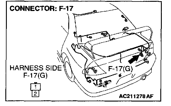 STEP 3. Check rear washer motor connector F-17 for loose, corroded or damaged terminals, or terminals pushed back in the connector.