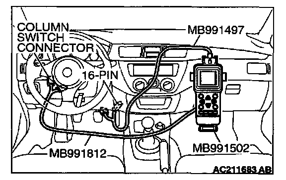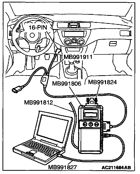 CAUTION: To prevent damage to scan tool MB991502 or MB991958, always turn the ignition switch to the "LOCK" (OFF) position before connecting or disconnecting scan tool MB991502 or MB991958. Connect special tool MB991497 or MB991911 before connecting special tool MB991812. Be sure to connect special tool MB991806 after turning on special tool MB991496 or MB991824.
