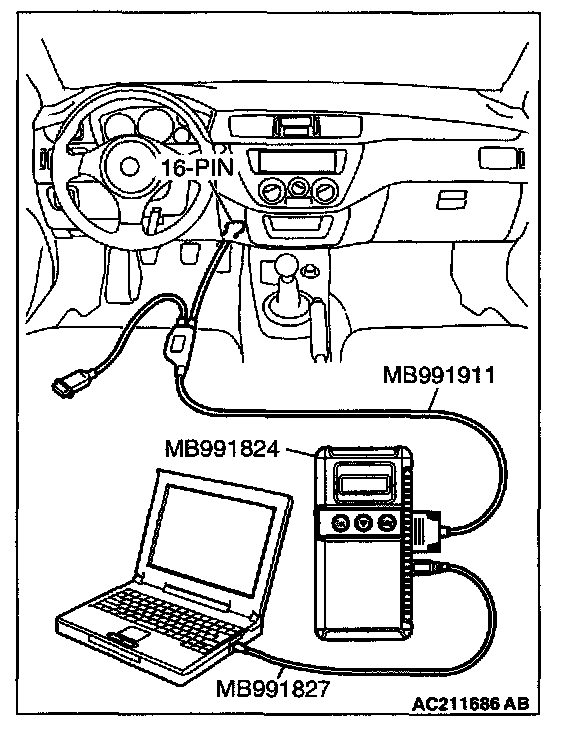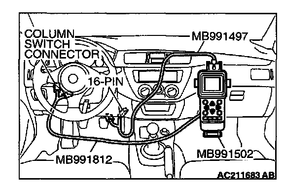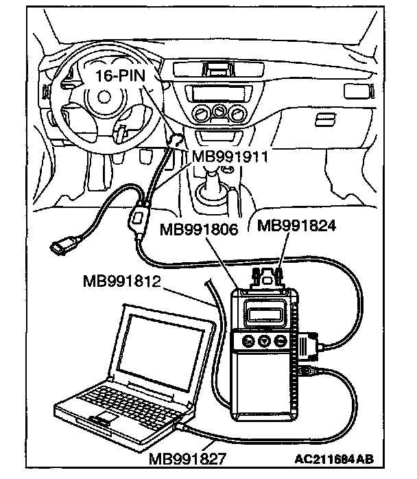 CAUTION: To prevent damage to scan tool MB991502 or MB991958, always turn the ignition switch to the "LOCK" (OFF) position before connecting or disconnecting scan tool MB991502 or MB991958. Connect special tool MB991497 or MB991911 before connecting special tool MB991812. Be sure to connect special tool MB991806 after turning on special tool MB991496 or MB991824.