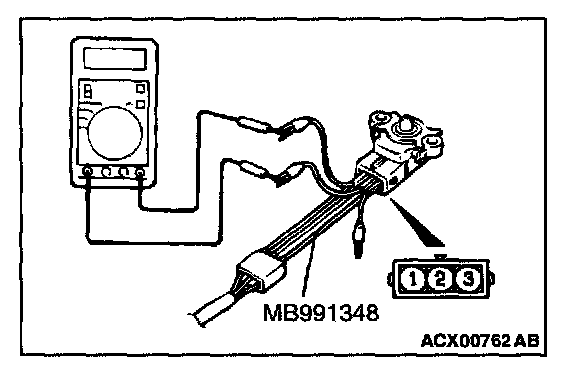 1. Disconnect the fuel tank differential pressure sensor connector and connect special tool MB991348 between the terminals of the disconnected connector.