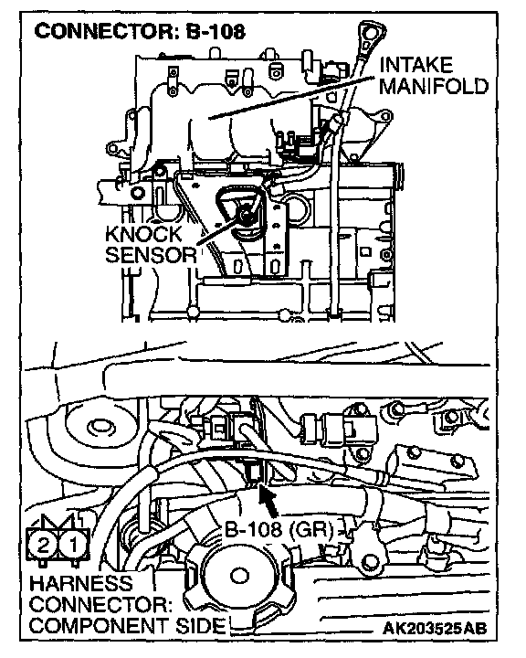 1. The ignition timing should retard more when knock sensor connector B-108 is disconnected than when it is connected.