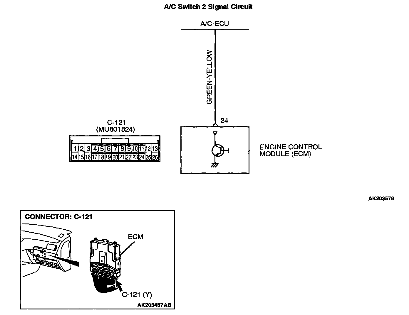 - The A/C-ECU detects how the air conditioning is applying load to the engine, and converts the information to a voltage signal (High voltage = low load, Low voltage = high load). This voltage signal is called "A/C switch 2 signal". The ECM receives this A/C switch 2 signal from the automatic compressor controller through terminal No. 24, and determines the idle-up speed according to the high or low air conditioning load.