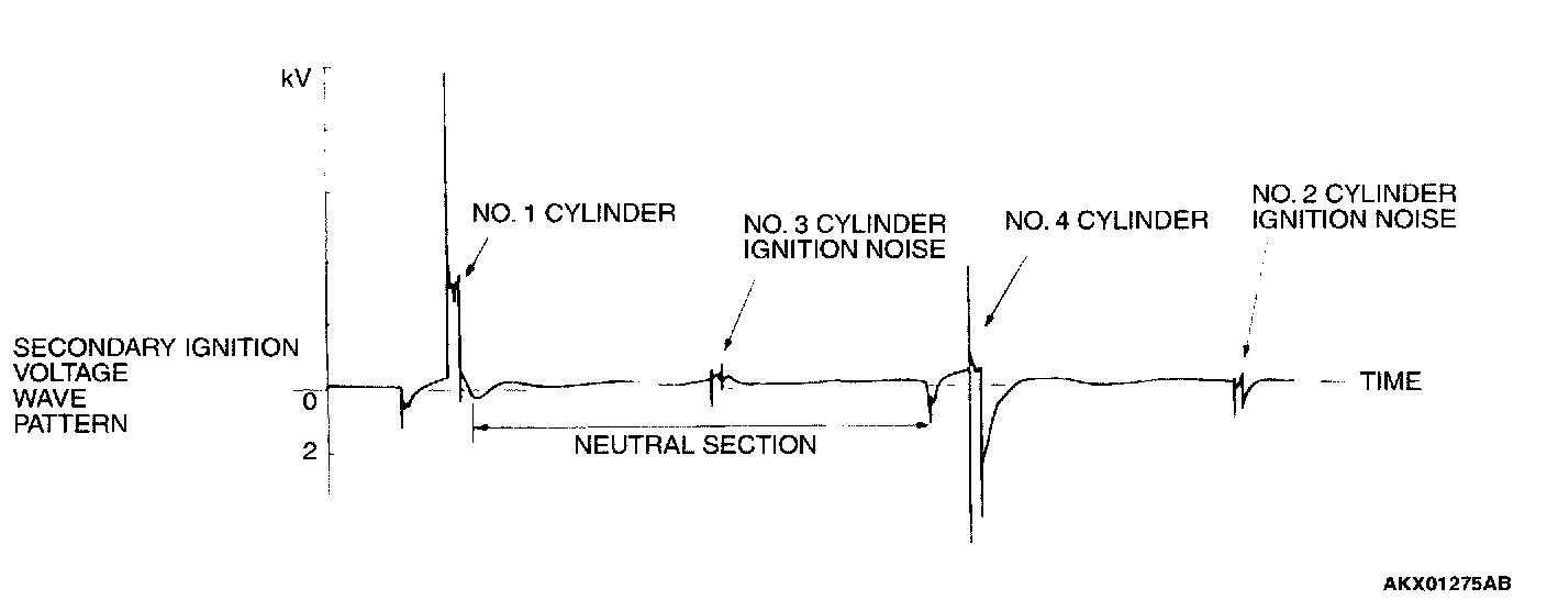 NOTE: Because of the two-cylinder simultaneous ignition system, the waves for two cylinders in each group appear during wave observation. However, wave observation is carried out for the cylinder (Number 1 or 3) with the spark plug cable which has been clamped by the secondary pickup.