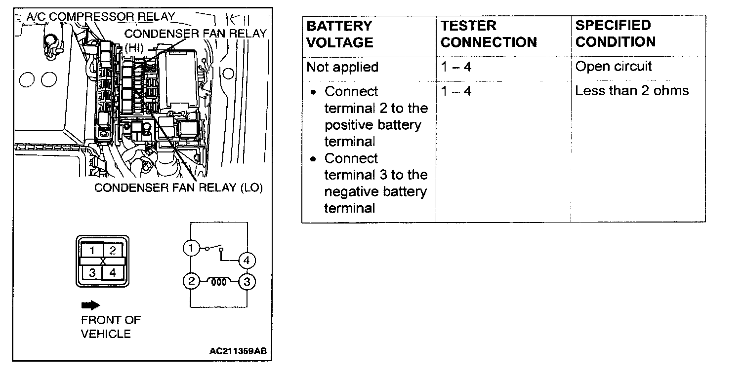 A/C Compressor Relay, Condenser Fan Relay (LO) And (HI) Continuity Check: