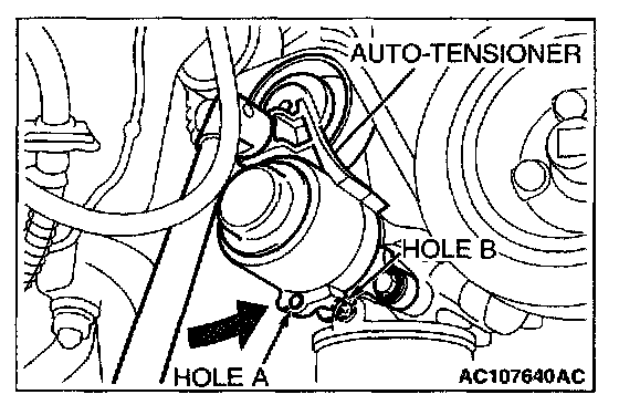 1. Securely insert the spindle handle or ratchet handle with a 12.7 mm (1/2-inch) insertion angle into the jig hole of the auto-tensioner, and turn the auto-tensioner counterclockwise until it hits the stopper. The following operations will be needed due to the serpentine drive system with the drive belt auto-tensioner.