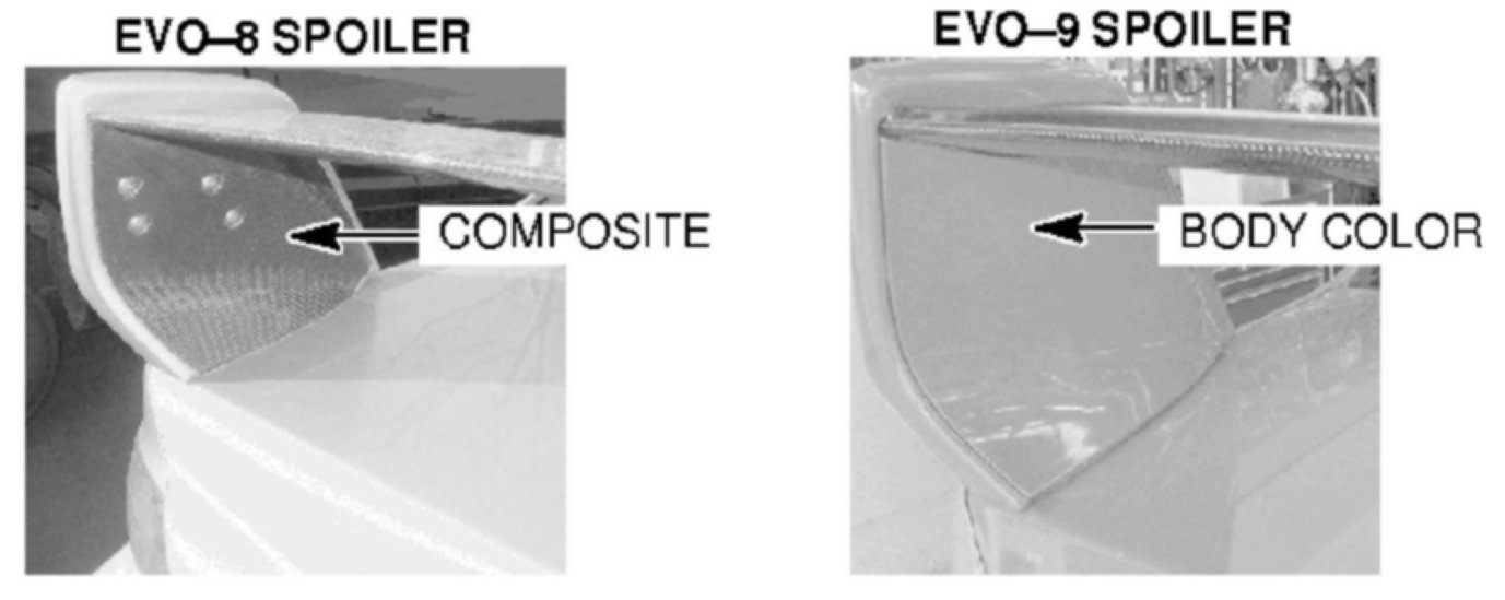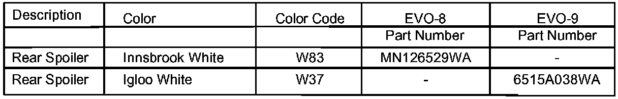 Replacement EVO-8 and EVO-9 spoilers listed in this bulletin have increased durability. EVO-9 spoiler replacement parts are slightly different in appearance than EVO-8 model spoilers. EVO-8 customers with affected spoilers in need of replacement due to the clear coat flaking condition should be offered to have their spoiler replaced with the more durable EVO-9 spoiler. IF THE CUSTOMER AGREES you may install the EVO-9 spoiler on affected EVO-8 models.