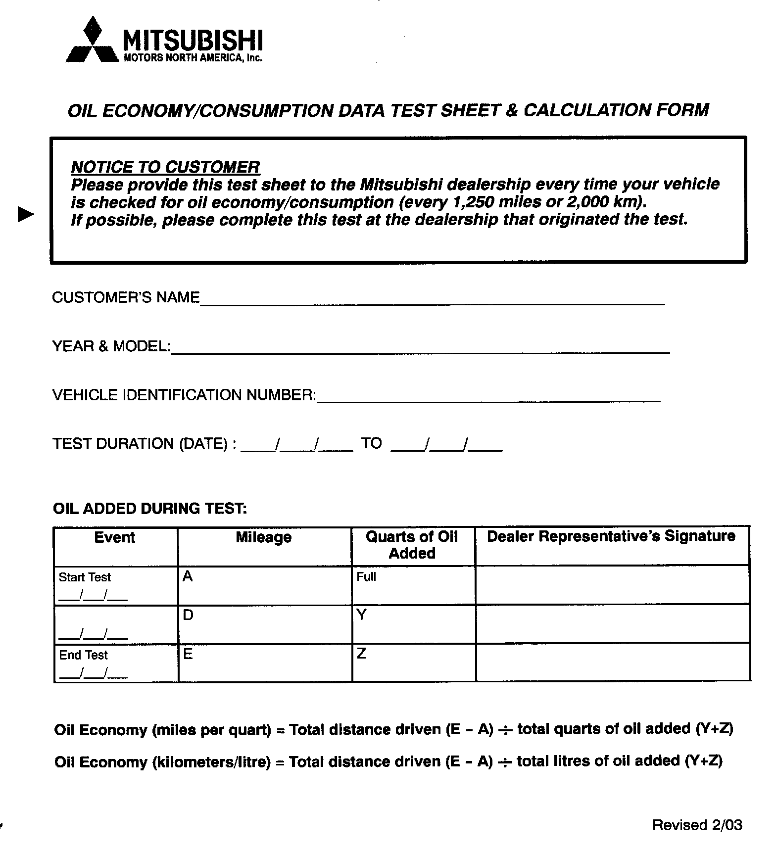 2. Ask the customer to participate in the oil economy/consumption test, and give them a copy of the --> "OIL ECONOMY/CONSUMPTION DATA TEST SHEET & CALCULATION FORM" at the end of this bulletin. Explain to the customer that they will be required to RETURN TO THE DEALERSHIP TWO TIMES, EVERY 1,250 MILES (+/- 50 MILES), or 2,000 km (+/- 80 km) TO HAVE THE OIL LEVEL CHECKED AND REFILLED IF NECESSARY. Emphasize to the customer the importance of returning AS CLOSE TO 1,250 MILES as possible. If the customer exceeds the allowable limit, the evaluation will be terminated and will have to be started again. The customer should NOT check the oil level during the evaluation period. The purpose of two visits is to obtain an accurate average of the engine's oil consumption. Do not take any position regarding the vehicle's condition or oil economy until the evaluation is completed and results are collected and reviewed by MMNA personnel.