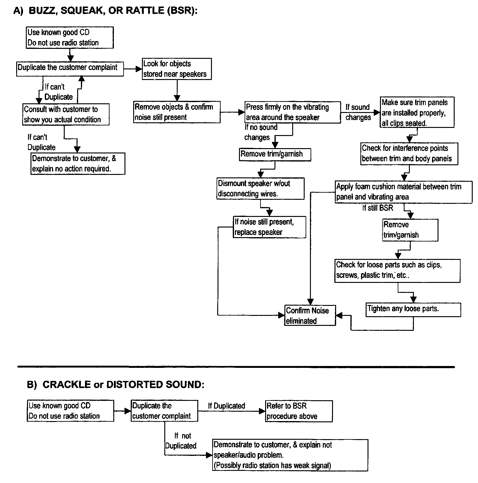 Proper diagnosis of speaker or speaker related conditions is important for customer satisfaction and correct warranty reporting. Some of these reported abnormal sounds, which are often attributed to the speakers, may have other origins. Speakers are often replaced without the actual problem being solved. In some cases, supposedly faulty speakers returned for warranty have been checked by the speaker manufacturer with no problem found. Make sure the suspected speaker is carefully evaluated before replacement. Use the troubleshooting procedures represented in the three flowcharts in this bulletin to help diagnosis speaker related conditions.