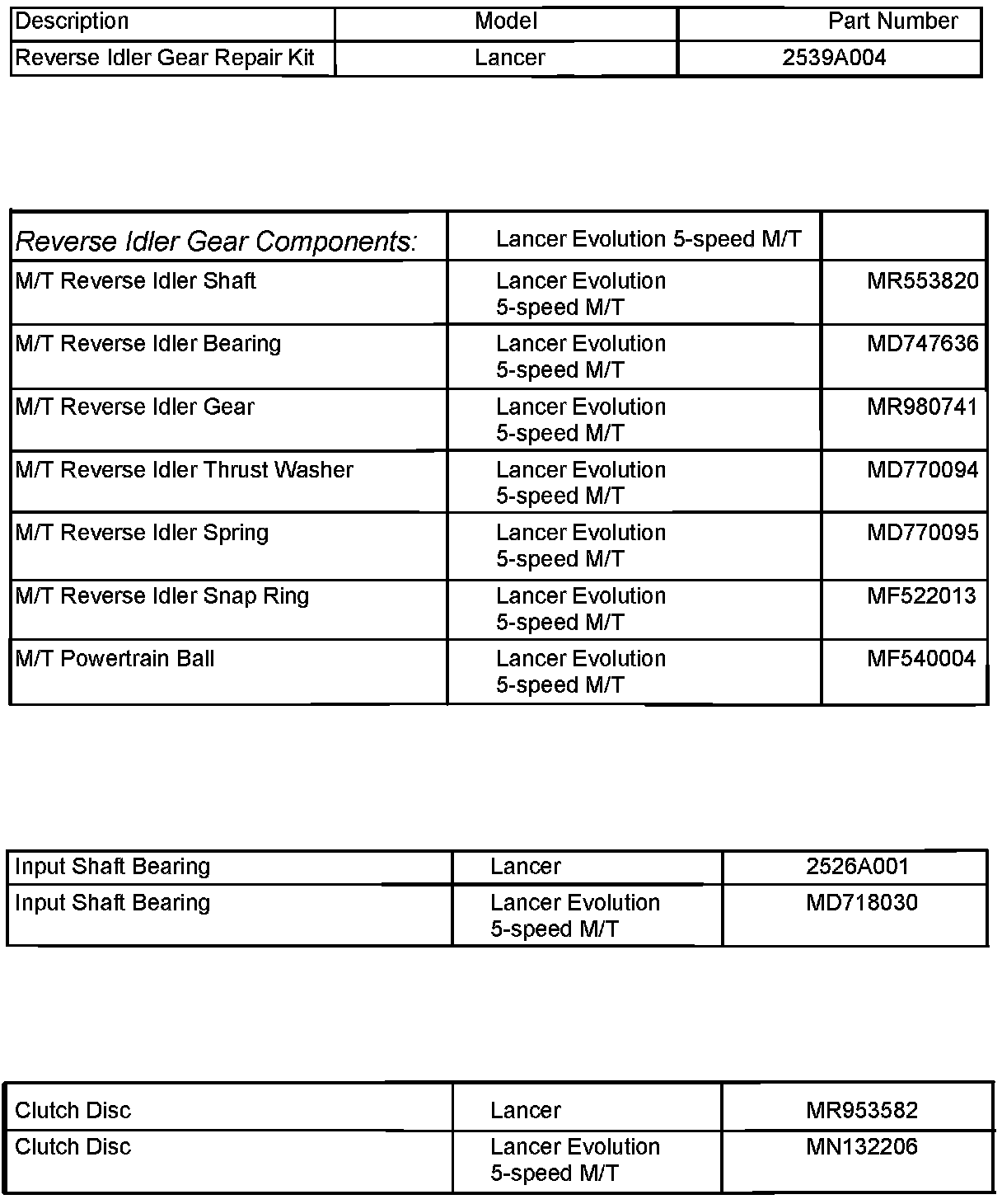 a. LANCER ONLY: Use the reverse idler gear kit (listed in the PARTS INFORMATION section of this bulletin) to replace the related parts. If the noise continues after installing the reverse idle gear repair kit, replace the clutch disc.